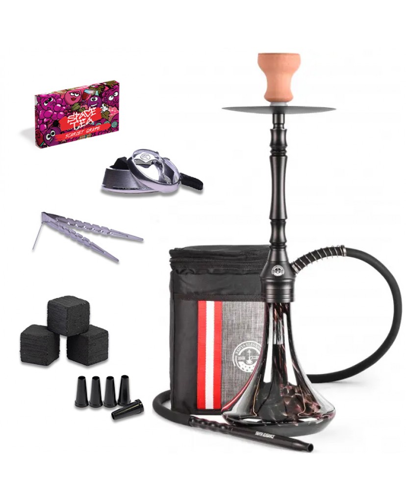 | Комплектація | Колба, Шахта, Мундштук, Шланг, Чаша, Блюдце, Ущільнювач під чашу, Калауд, Щипці, Дифузор, Вугілля кокосове (3 кубики). Одноразові мундштуки (5 шт.), Сумка, Безнікотинова суміш Space Tea 40 г. |